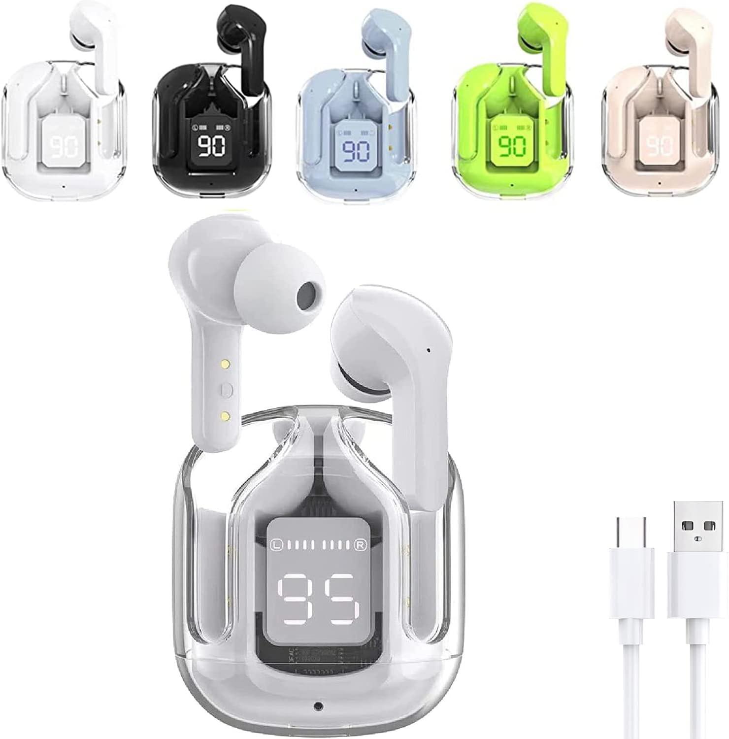 - [Pantalla digital LED y diseño colorido] Pantalla LED precisa de la potencia del estuche de carga y de ambos auriculares, lo que le permite conocer el estado de energía de los auriculares inalámbricos y del estuche de carga en cualquier momento. Esta serie de auriculares Bluetooth con estuche de carga translúcido, textura futurista, 5 colores diferentes. Los auriculares impermeables pueden prevenir eficazmente los daños por salpicaduras causados por el sudor y las gotas de lluvia.